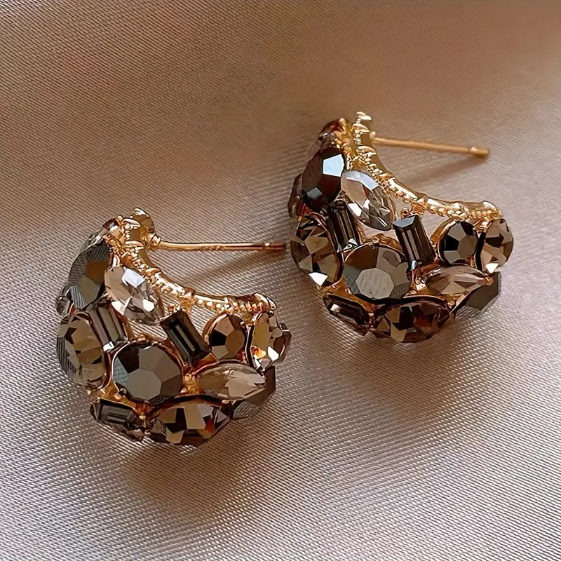 Shine bright with our Crystal Cluster Earrings, featuring a stunning arrangement of multi-faceted crystals in shades of amber and grey, set in an intricate gold-tone design. Perfect for adding a bold yet elegant touch to your ensemble, these statement earrings are ideal for any special occasion or everyday glamour.