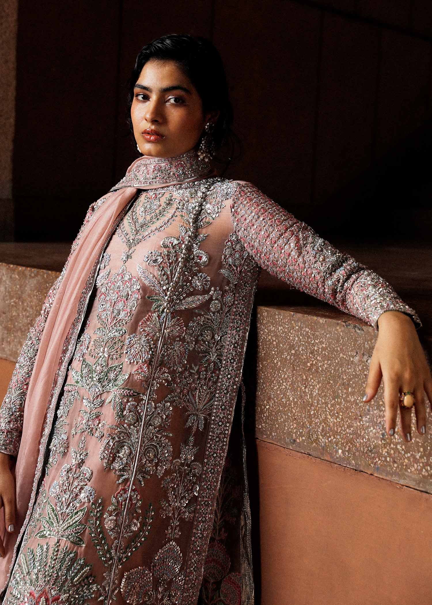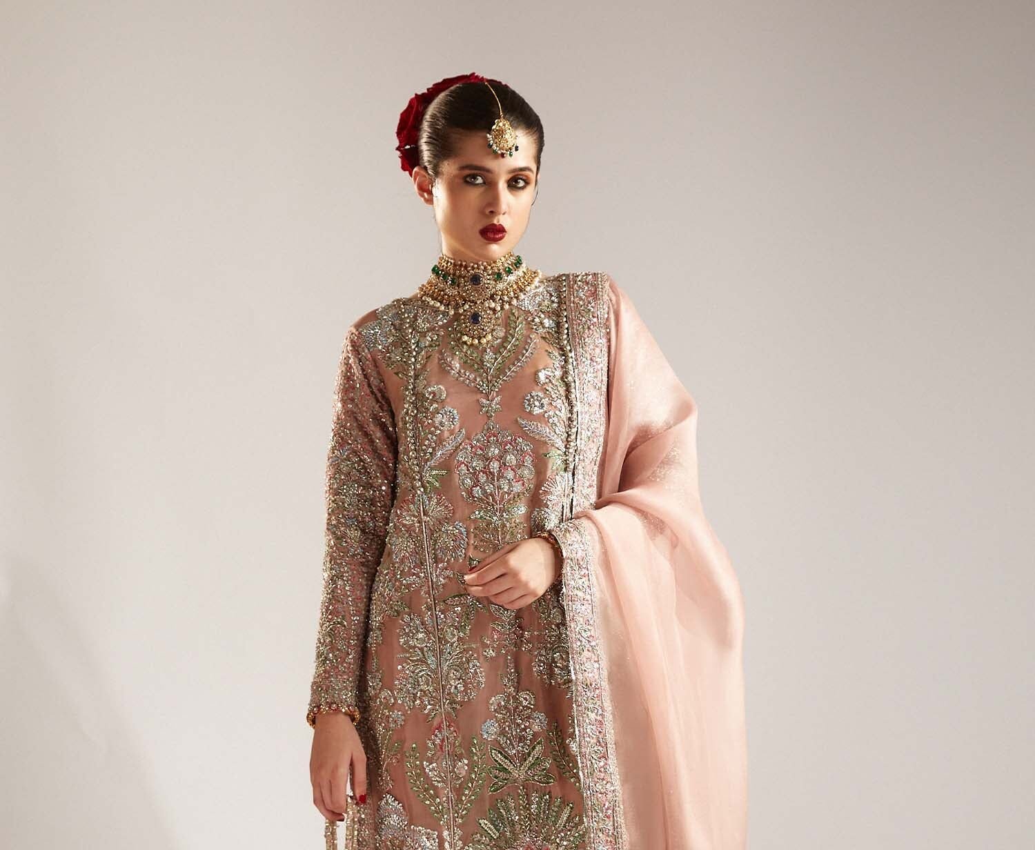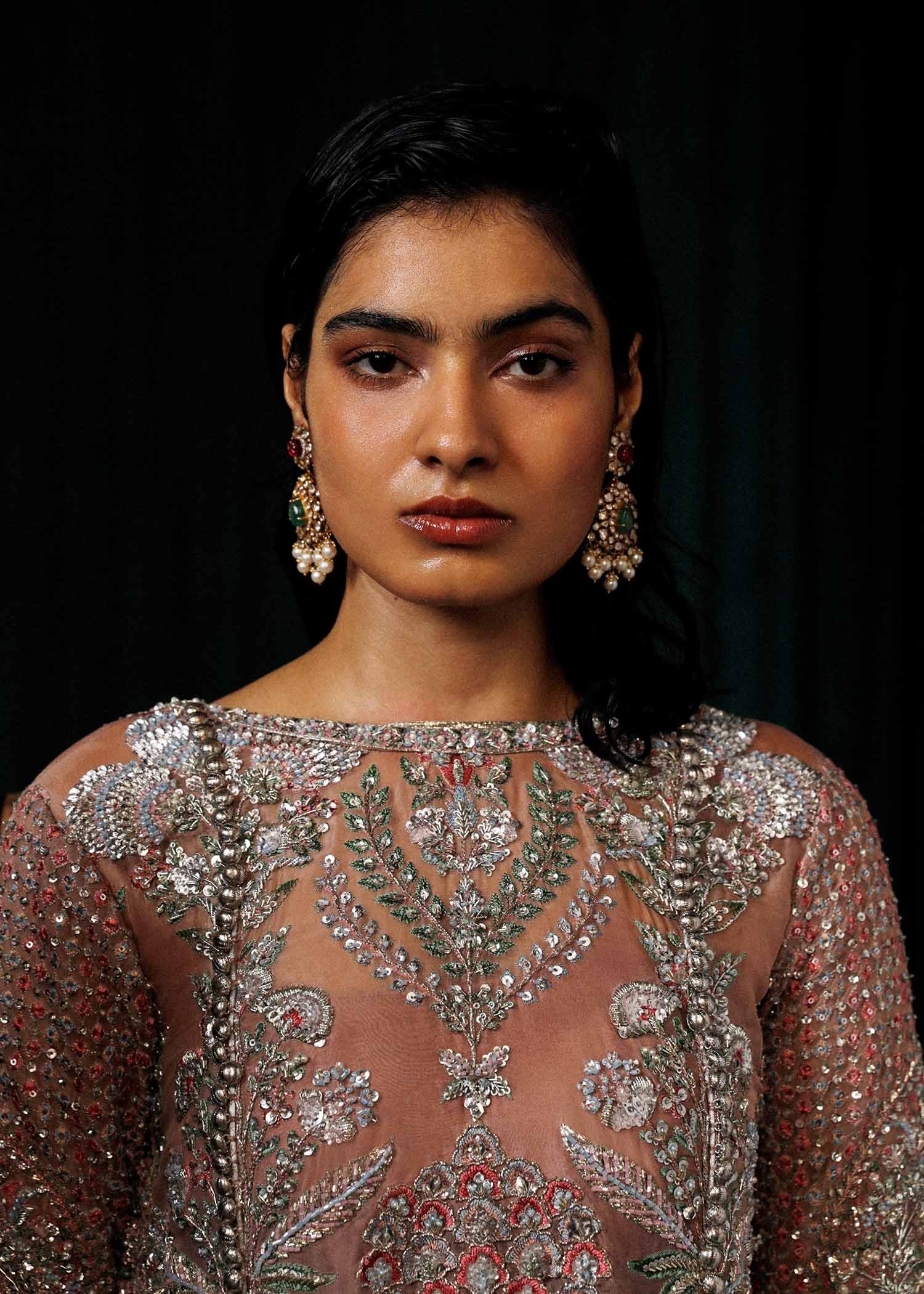 This regal outfit rendered in a beautiful shade of Grey on an organza canvas for shirt , with heavy embellished motifs along with intricate details. The timeless look is completed with an organza dupatta along with four side heavy embellished borders with 3 different corner motifs embellished with sequins, cut dana and with nakashi, dabka concluding the look marvelously.