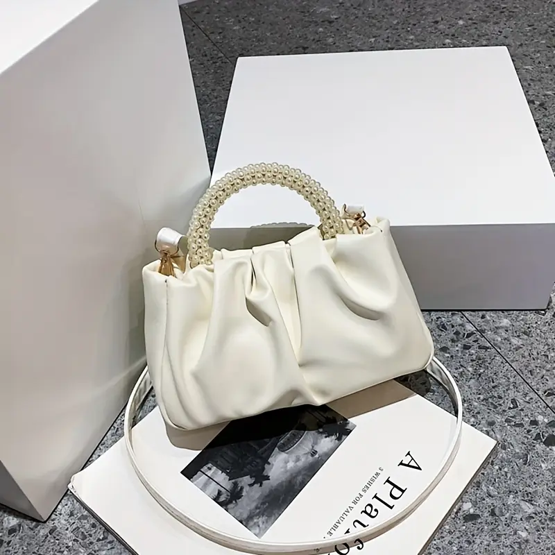 Elevate your style with our Pearl Handle Clutch Bag, featuring a luxurious cream-colored design with a unique pearl-embellished handle. Crafted from soft, pleated faux leather, this elegant handbag adds a touch of sophistication to any outfit, making it perfect for weddings, parties, or evening outings.
